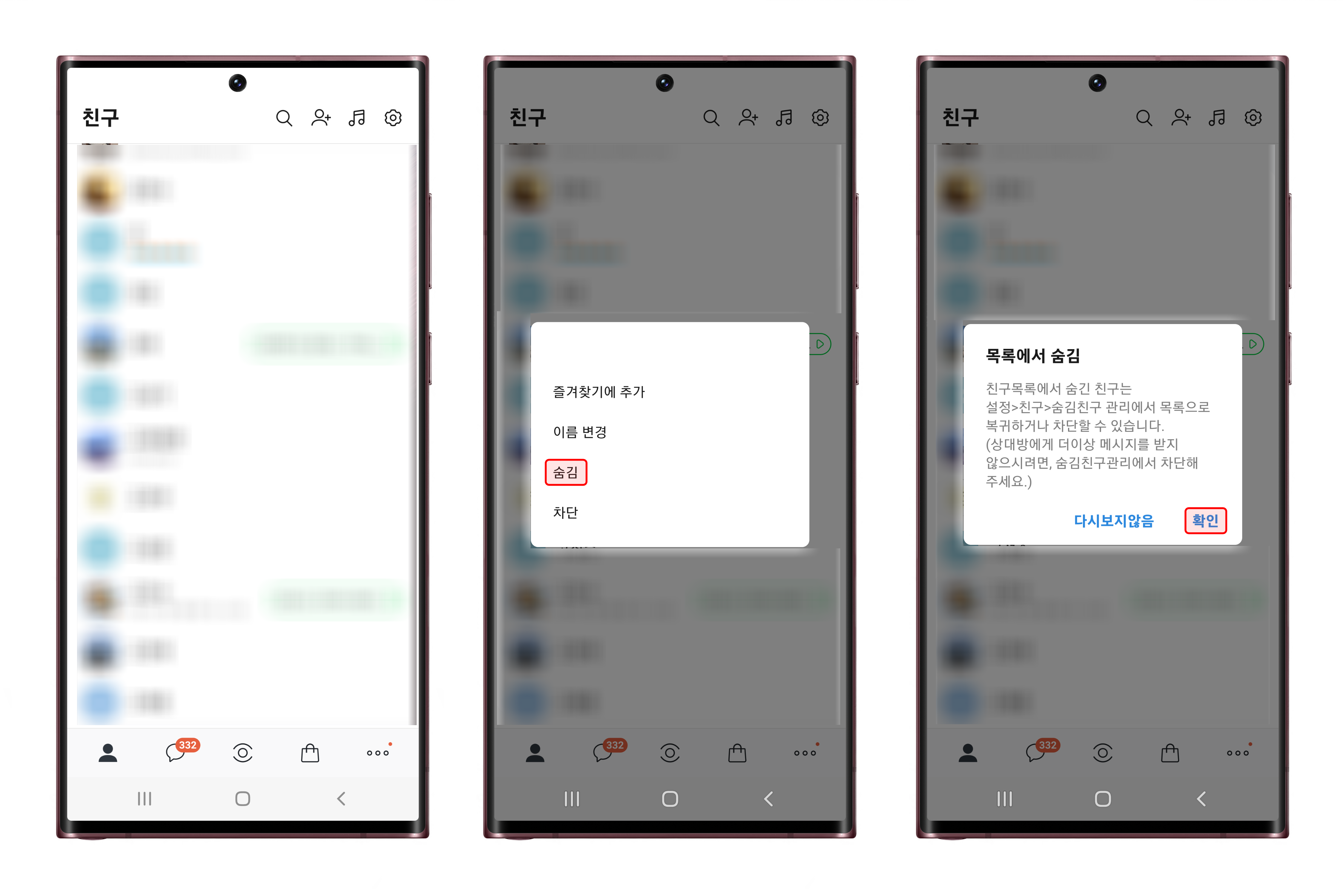 카카오톡 친구를 삭제하는 방법~(숨김 또는 차단) 상대방을 잘못 등록하였거나 더 이상 연락드릴 일이 없을 경우에는 등록한 친구를 삭제할 수 있습니다~1. 친구화면에서 상대방 계정을 꾹 눌러주시면 아래와 같이 팝업창이 뜹니다 세번째 숨김버튼을 누르시면 목록에서 숨김으로 확인하기를 눌러주세요